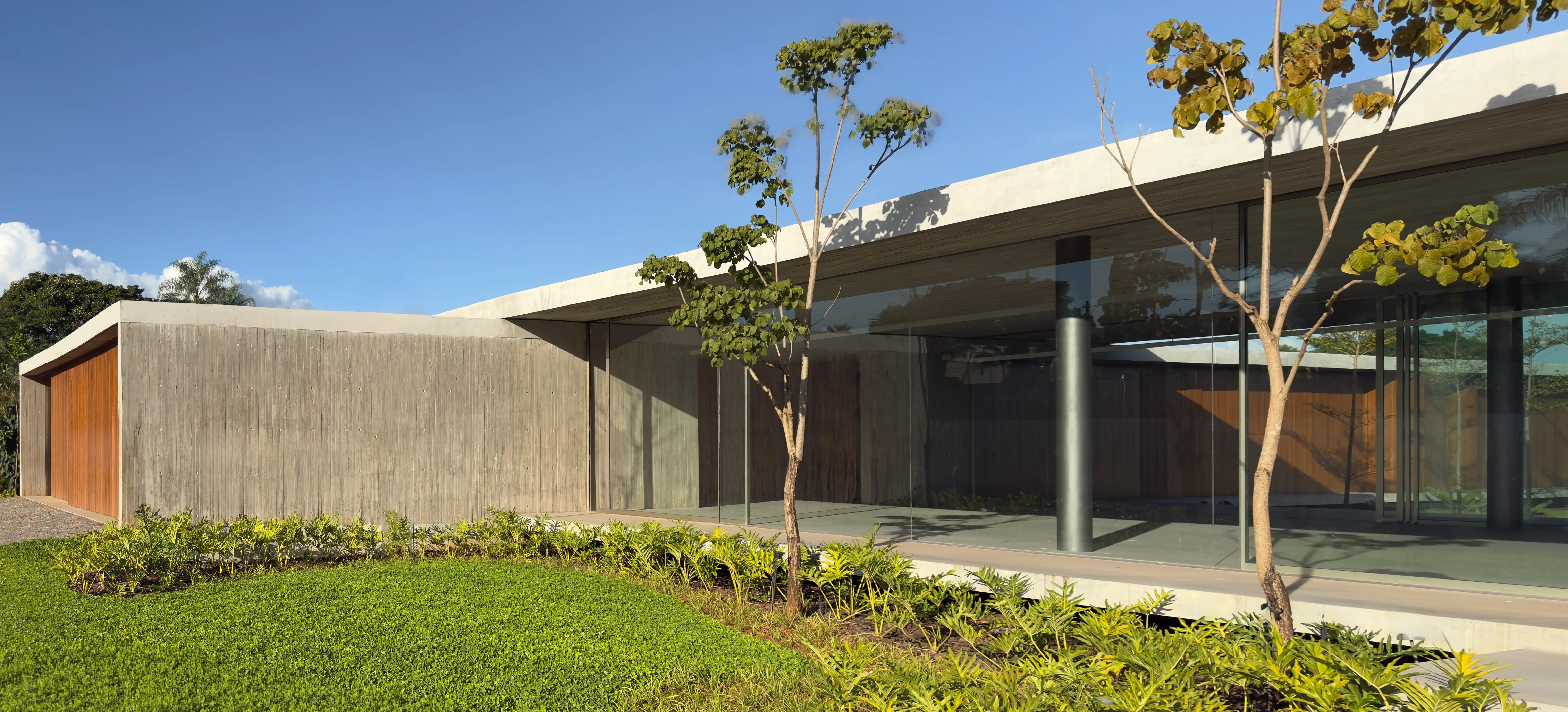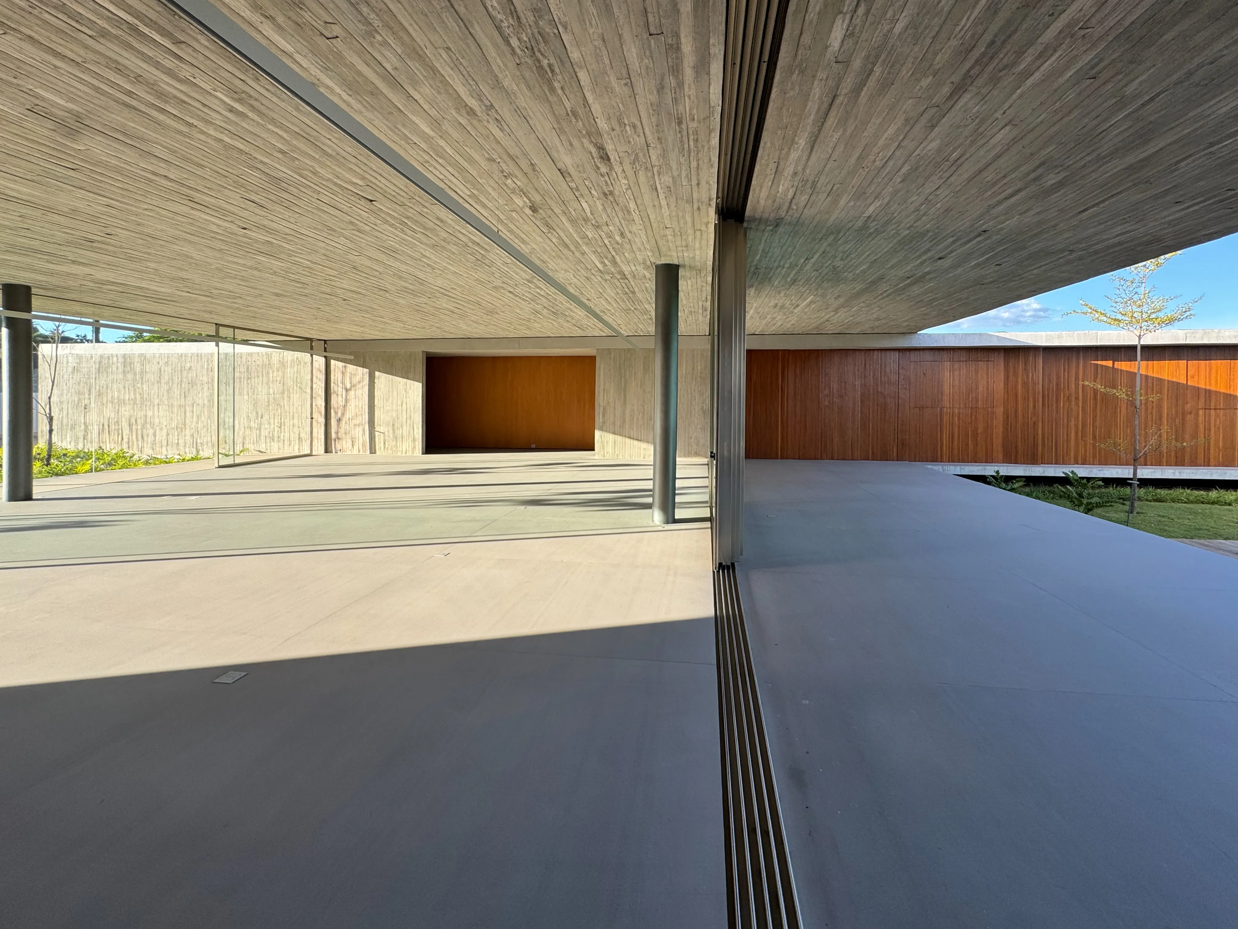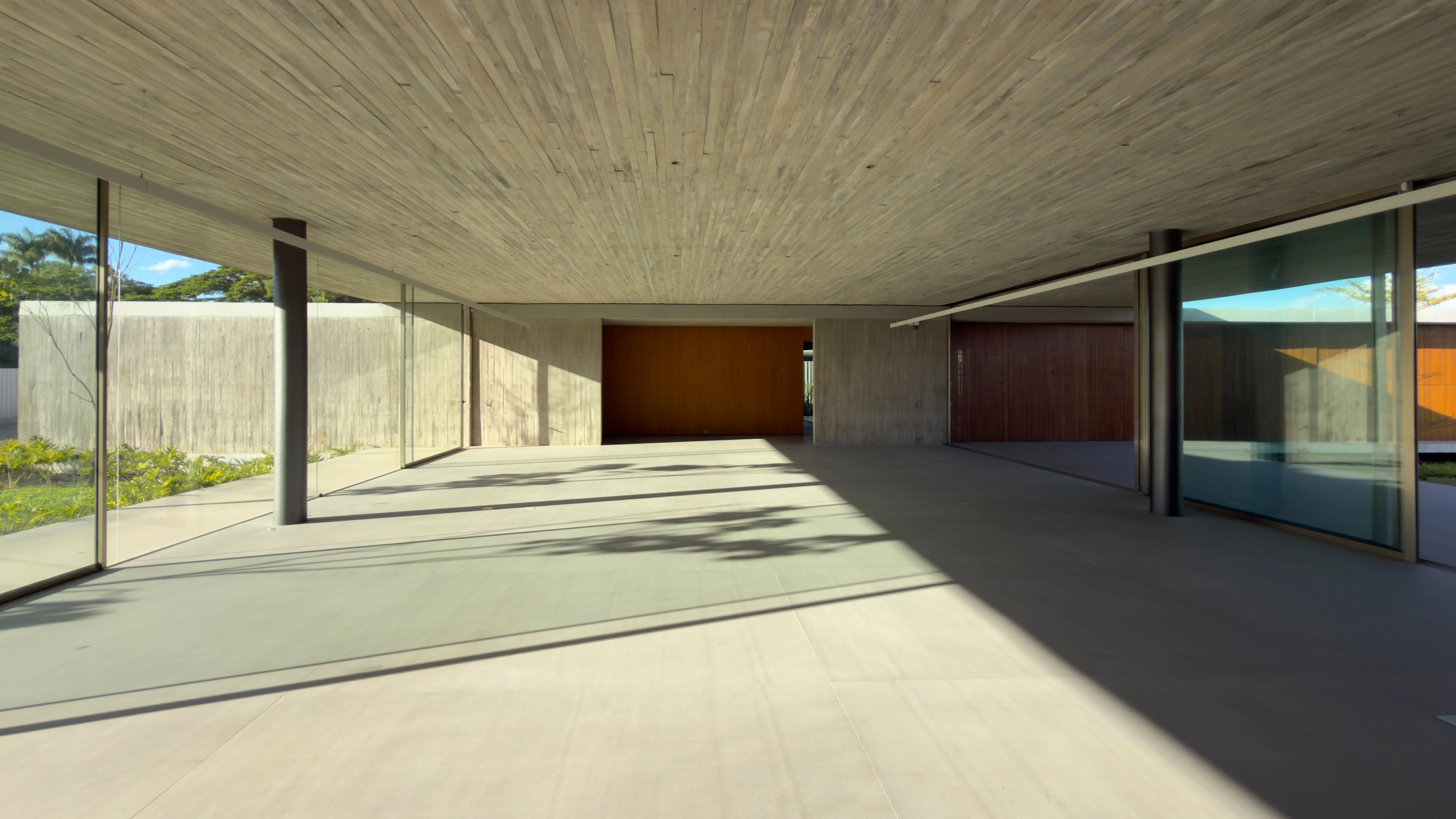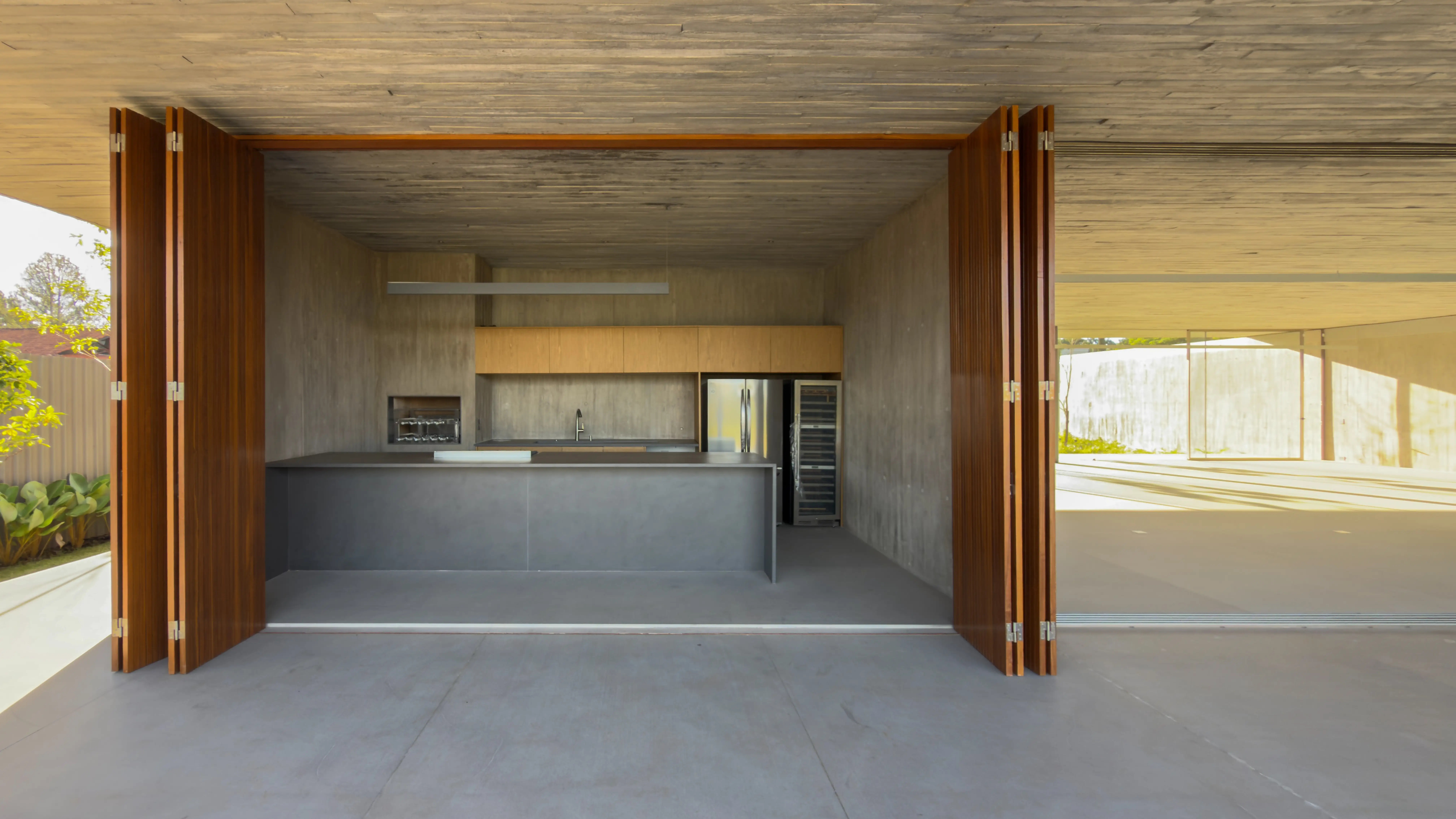 Estrutura e Acabamentos: Concreto aparente com piso e teto em madeira Cumaru. Os portais e a madeira ripada das esquadrias também são em Cumaru, enquanto as portas são de madeira maciça.