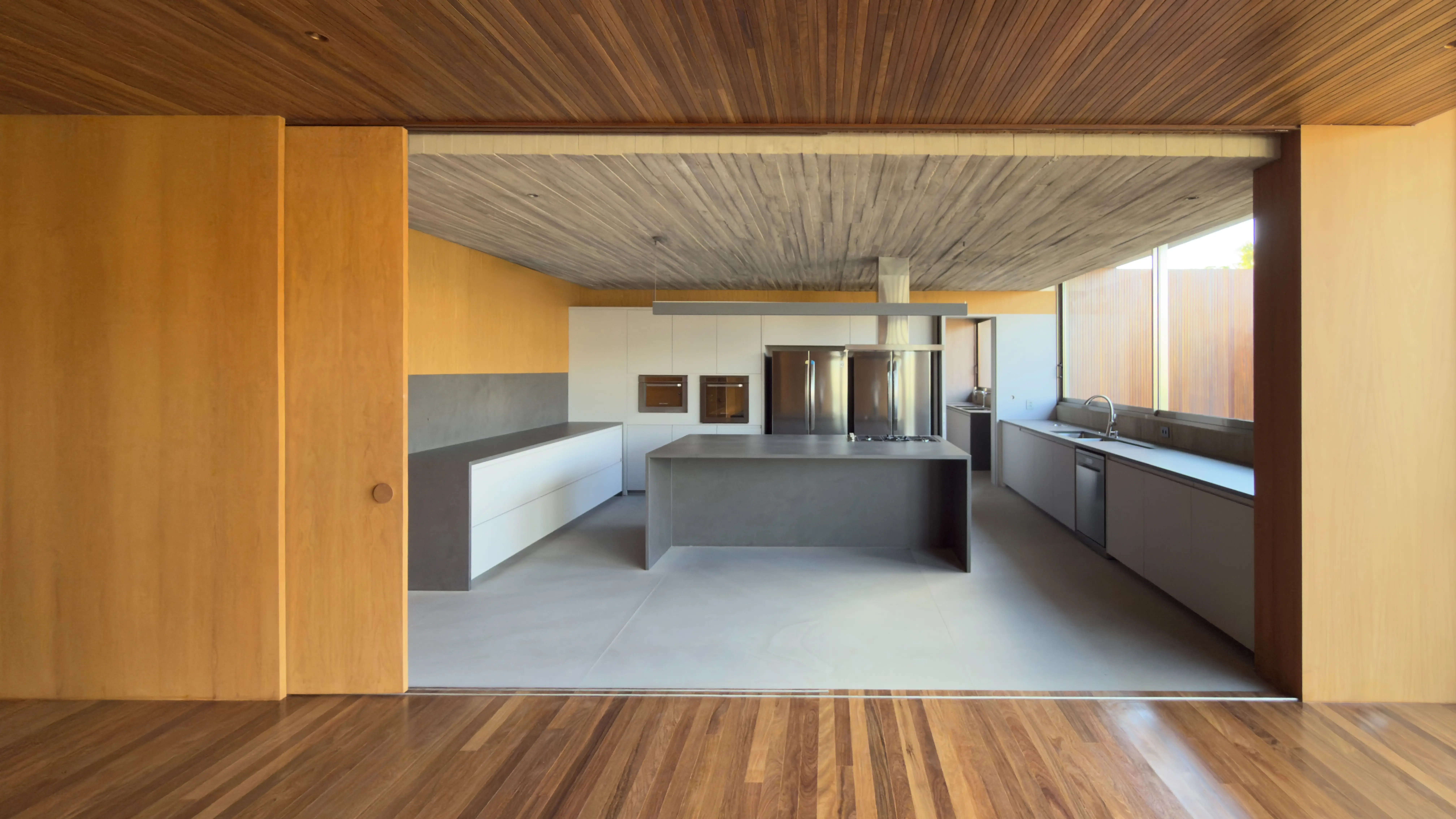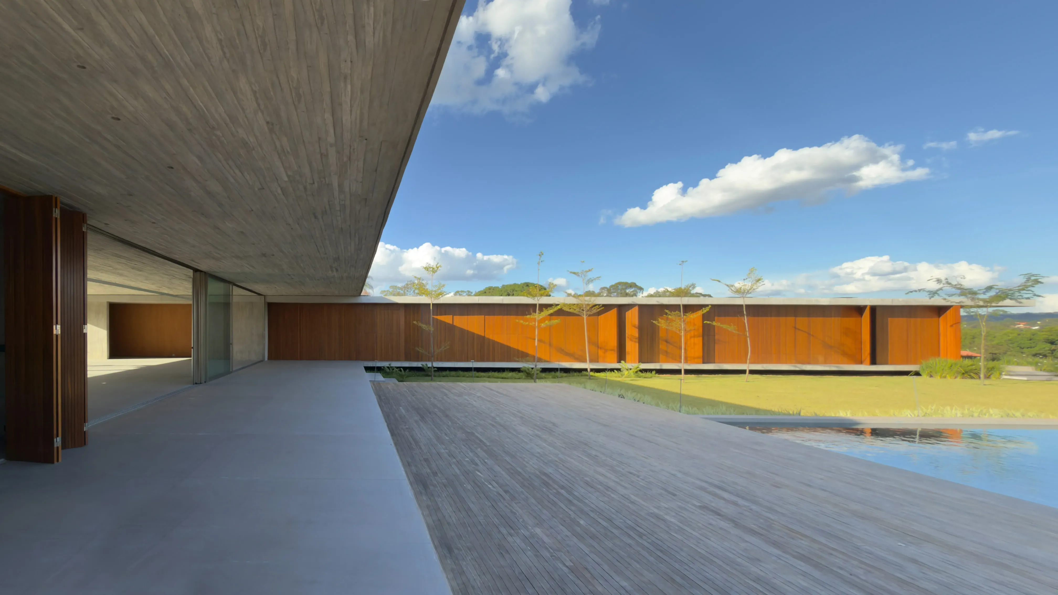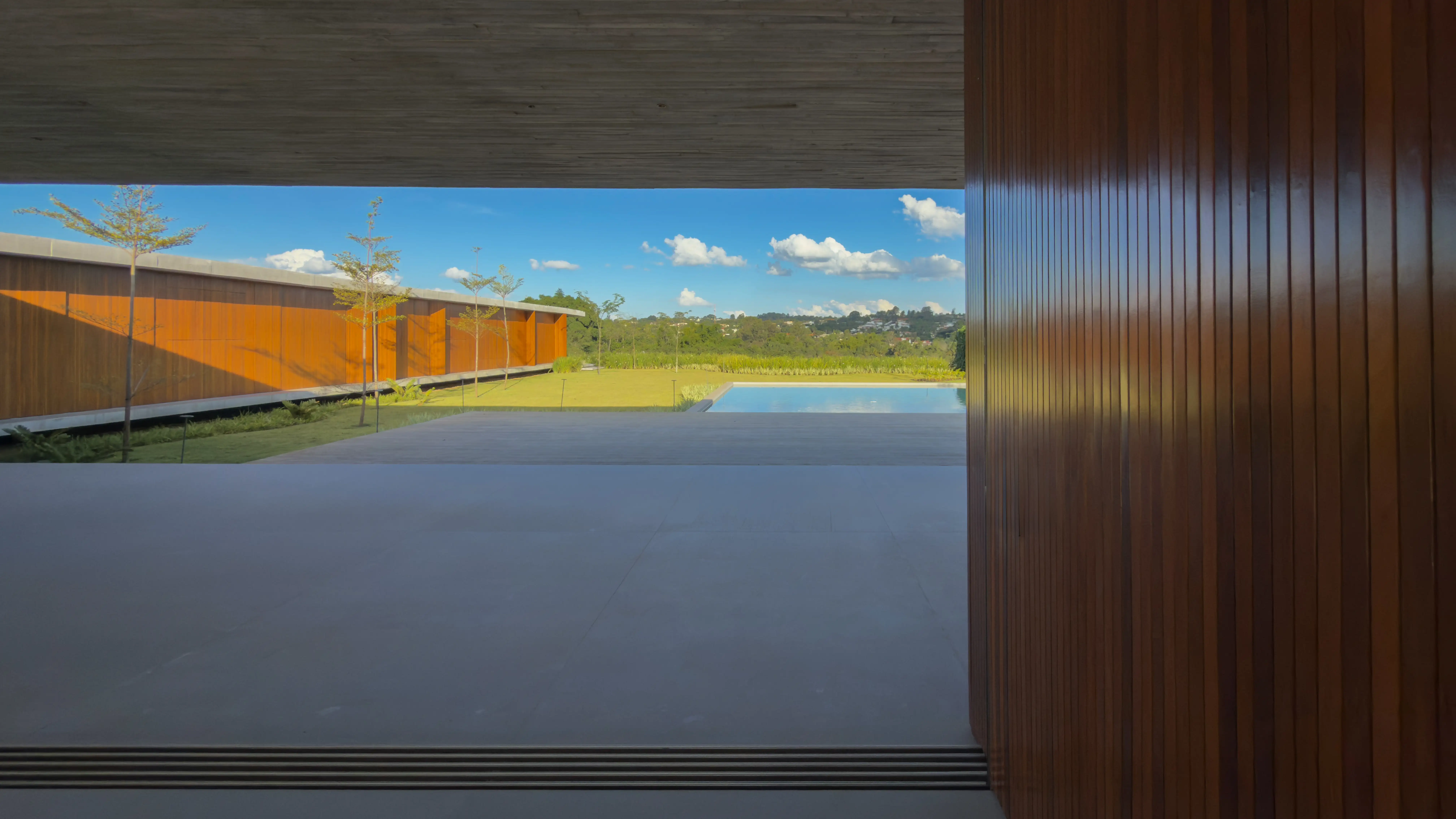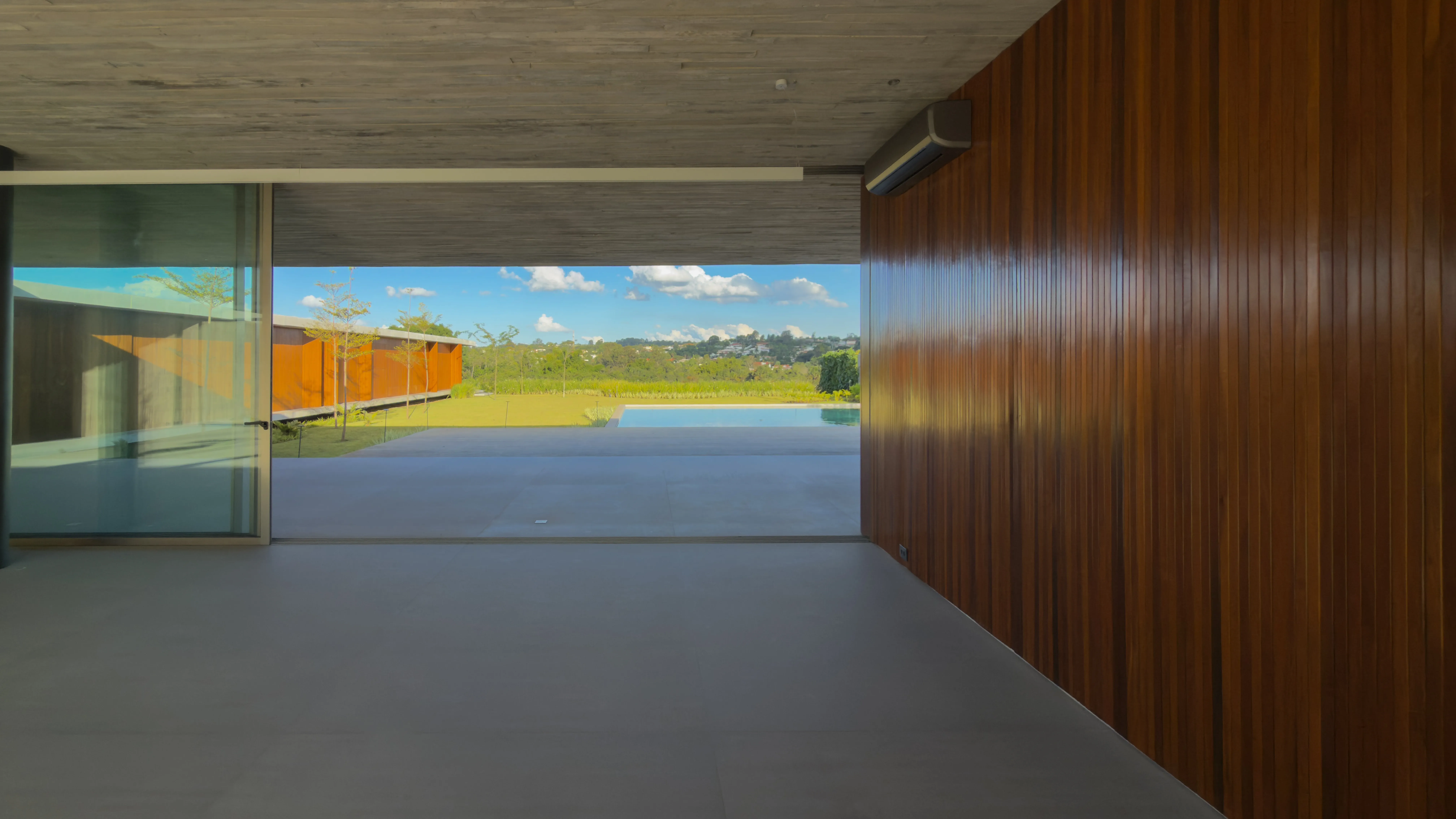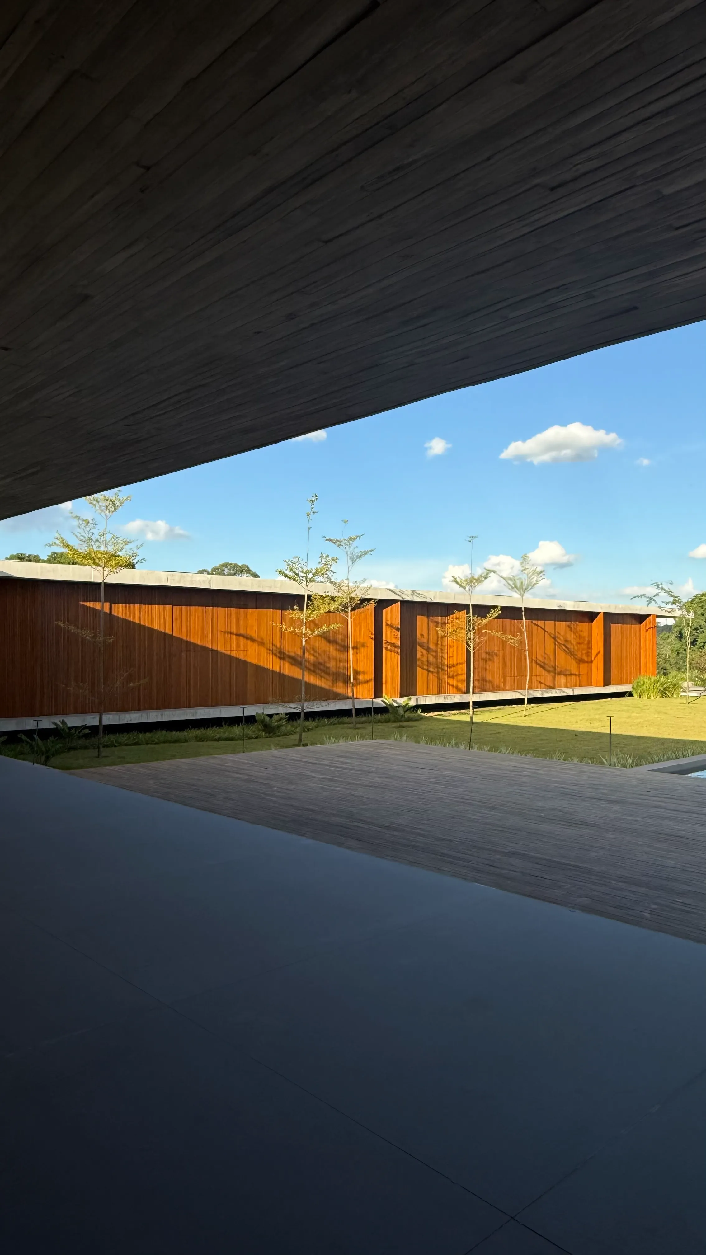 Estrutura e Acabamentos: Concreto aparente com piso e teto em madeira Cumaru. Os portais e a madeira ripada das esquadrias também são em Cumaru, enquanto as portas são de madeira maciça.